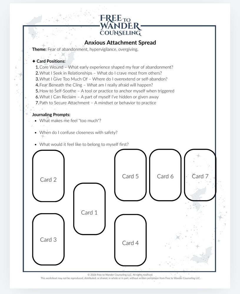 This comprehensive bundle includes 16 worksheets 105 pages designed to support therapeutic exploration across key areas of personal growth and relational health, including values, communication, grounding, self-esteem, self-care, attachment, and navigating dysfunctional family dynamics. Each worksheet uses tarot symbolism as a reflective and metaphorical tool, providing clients with a structured way to explore thoughts, emotions, and behavioral patterns while fostering insight and self-awareness.