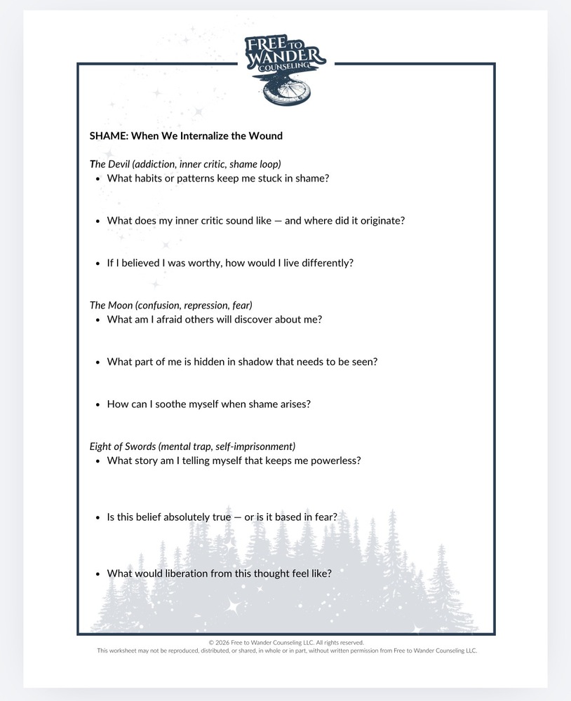 Shame & Guilt Pathway is three worksheets 26 pages designed to gently guide clients through the complex layers of shame and guilt using shadow work, tarot symbolism, and structured self-awareness practices. Through guided reflection and exploration exercises, clients are supported in identifying core beliefs, internalized narratives, and protective patterns that maintain shame cycles.