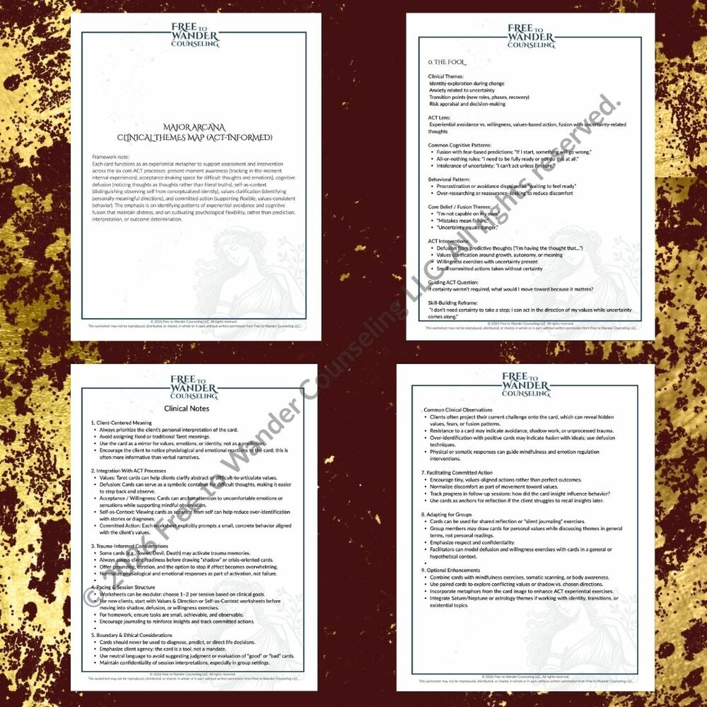 The Major Arcana Clinical Theme Mapping (ACT-Informed | In-Session Use Only) is a structured 25 page framework that uses each Major Arcana card as a symbolic, experiential metaphor to support Acceptance and Commitment Therapy processes in real time. Designed to be non-divinatory, the map helps clinicians identify experiential avoidance, cognitive fusion, values disconnection, and behavioral rigidity while promoting psychological flexibility within the session.
